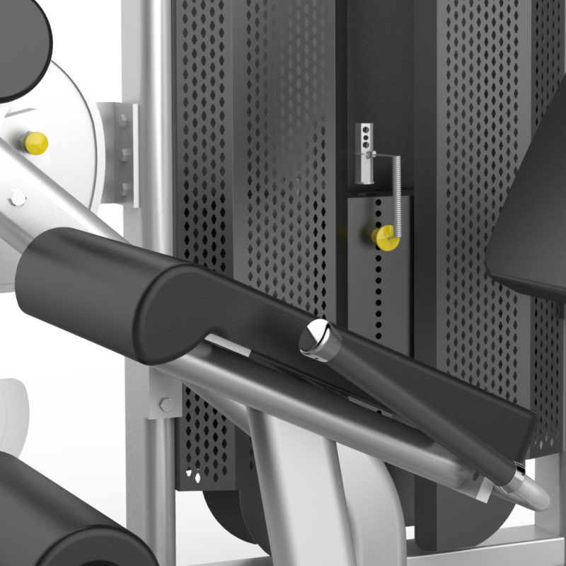 The padded leg support pad (resting against the shins) secures your lower legs, while the connected linkage component (paired with the yellow adjustment point) translates leg extension movements into smooth, controlled resistance—delivering consistent tension to the quadriceps (front thigh muscles) with every rep.