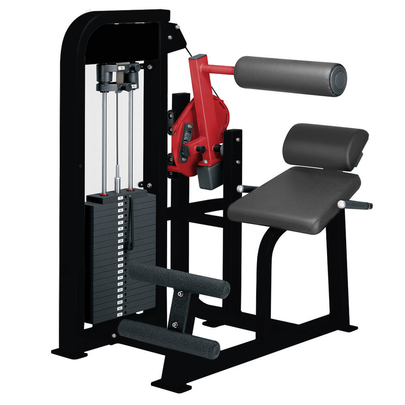 Upper Back Support & Resistance Arm: Padded roller stabilizes upper body form; red arm links to the weight stack to deliver adjustable resistance.